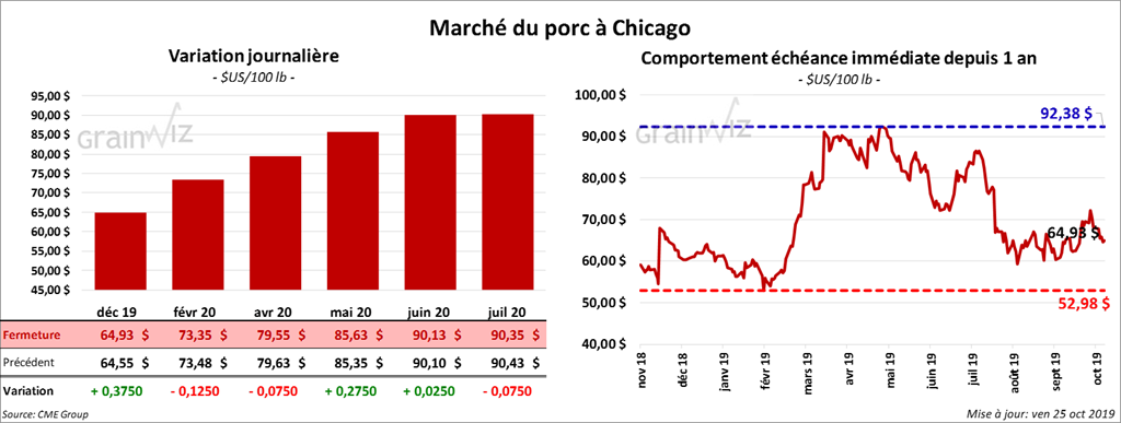 Les contrats de porc US ont terminé la session sur une note partagée. Le contrat décembre 19 a pris 37 cents. Par contre, sur la semaine, il a reculé de 3,025 $.