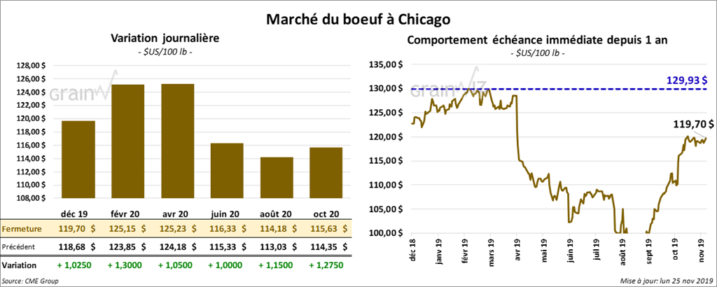 Dans le rapport Cold Storage présenté vendredi dernier, le USDA mentionne que les stocks de surgelé de bœuf US au cours du mois d’octobre ont été évalués à 466,219 millions de lbs., ce qui est une baisse de 9,57 % par rapport à octobre 2018. Il s’agit aussi d’un bas pour les 5 dernières années. Le rapport Cattle-on-Feed a également été rendu public vendredi passé. Il indique qu’au 1er novembre dernier, les inventaires des parcs d’engraissement ont été de 11,831 millions de têtes. Les placements au mois d’octobre se sont aussi chiffrés à 2,477 millions de têtes, ce qui équivaut à une hausse mensuelle de 10,19 %. La commercialisation a été évaluée à la baisse de 0,64 % à 1,875 million de têtes.