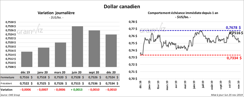 Ce matin, le USDA présentait son rapport sur les inspections à l’exportations de la semaine du 21 novembre dernier. Il a été estimé que les inspections de maïs US ont été de 604,592 tonnes alors qu’elles avaient été de 651,147 tonnes la semaine précédente et de 1,182 million de tonnes l’an passé. Le cumulatif annuel des inspections à l’exportation de maïs US est actuellement à 5,598 millions de tonnes, ce qui représente une baisse de 57,48 % comparativement à l’an dernier à la même période.