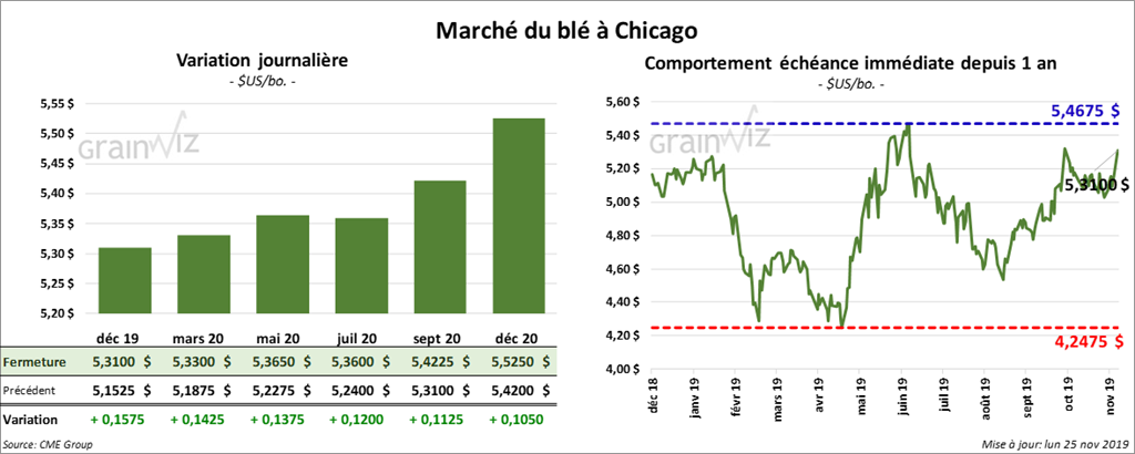 Les contrats de blé à Chicago ont terminé la session avec des gains de 15 cents. Les deux autres places de marchés ont également bien fait.