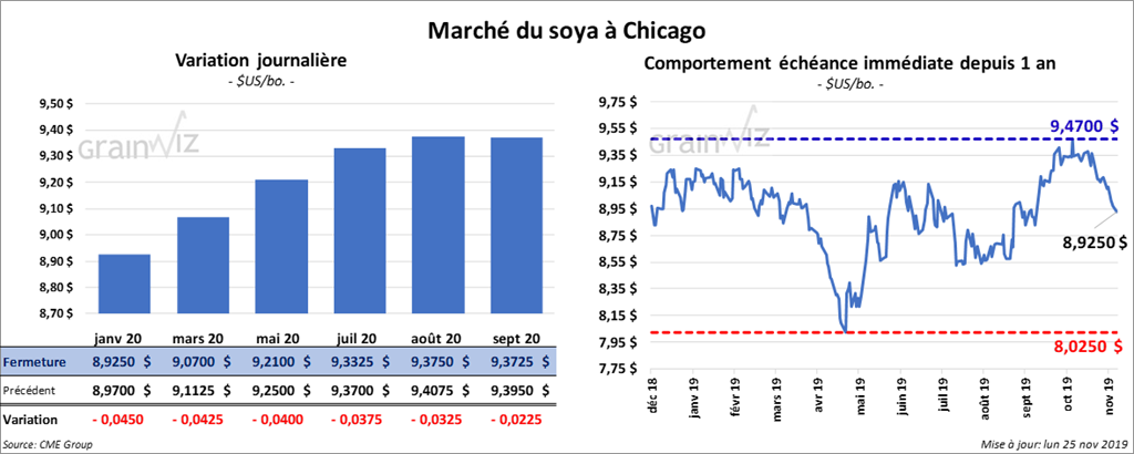 Les contrats de soya US ont fini la session en baisse de 3 ¾ à 4 ½ cents. Le tourteau a également clôturé dans le rouge de 70 cents/tonne. L’huile a perdu 44 points.