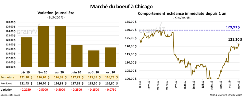Les contrats de bœuf US ont terminé la journée en baisse de 22 à 50 cents. Sur la semaine, ils ont tout de même gagné 2,13 %. Les contrats de veau US aux échéances les plus rapprochées ont clôturé dans le rouge de 65 cents à 1,50 $. Par contre, sur la semaine, ils ont progressé de 3,00 $.