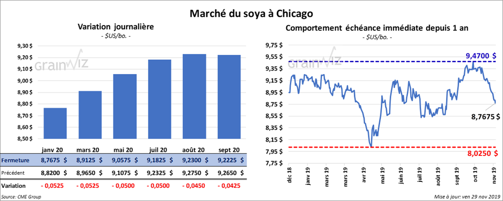 Le rapport sur les ventes à l’exportation de la semaine du 21 novembre dernier a été présenté dans le courant de l’avant-midi. Dans le cas du soya US, les ventes de 1,664 million de tonnes ont surpassé les anticipations du marché. Il s’agit d’une augmentation hebdomadaire de 14,1 %, ce qui a poussé le cumulatif annuel des engagements à l’exportation de soya US à la hausse de 9,5 % à 25,260 millions de tonnes. Quant au cumulatif des expéditions pour les 12 premières semaines de l’année commerciale en cours, il a été établi à 14,490 millions de tonnes, ce qui est une baisse de 7,42 % par rapport à la moyenne des 10 dernières années, mais aussi une augmentation de 23,5 % comparativement à l’an dernier. Selon le rapport, les expéditions hebdomadaires ont été de 2,245 millions de tonnes, ce qui en fait le résultat hebdomadaire le plus élevé depuis novembre 2017. Par ailleurs, les ventes de tourteau au cours de la semaine du 21 novembre dernier ont été inférieures aux prévisions du marché avec 93,165 tonnes. Ce résultat est le plus faible depuis l’été dernier. Quant aux ventes à l’exportation de l’huile de soya US, elles ont été de 14,865 tonnes.