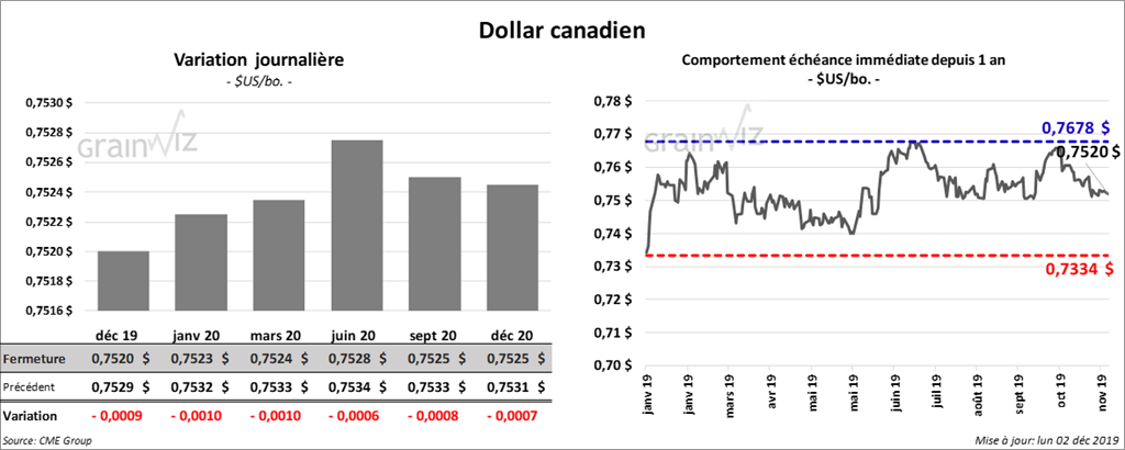 Les contrats de blé US ont fini la session en baisse. À Chicago, les contrats de blé aux échéances les plus rapprochées ont clôturé dans le rouge de 4 ¼ cents. À Kansas, les contrats de blé aux échéances les plus rapprochées ont terminé en baisse de 1 ½ cents. À Minneapolis, les contrats ont reculé de 5 cents. Le contrat décembre 19 expirera le vendredi 13 décembre.
