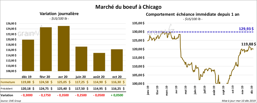 Les contrats de bœuf US ont fini la session en baisse de 12 à 30 cents. Le contrat décembre 19 a reculé de 27 cents. Les contrats de veau US aux échéances les plus rapprochées ont fait l’inverse en gagnant de 50 à 57 cents.