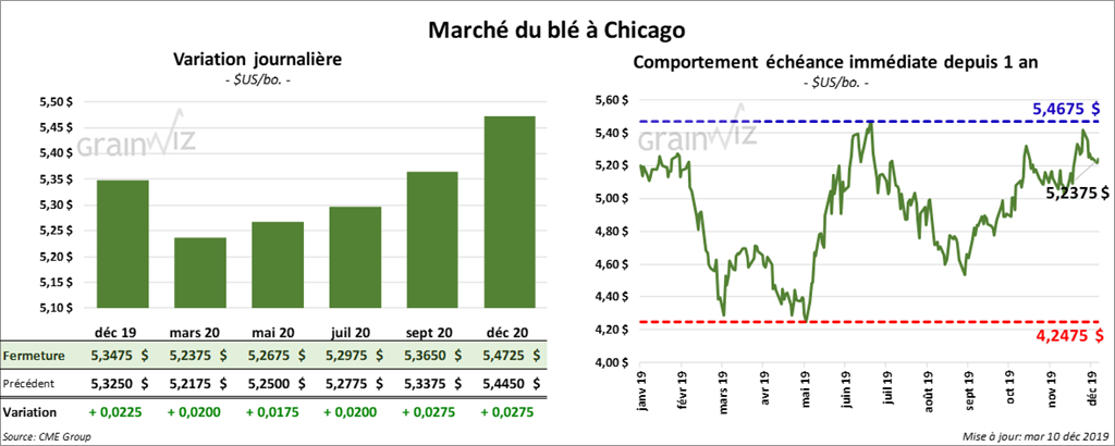 Mondialement, les inventaires de blé ont été revus à la hausse de 1 million de tonnes comparativement à novembre dernier à 289,5 millions de tonnes. Le USDA a aussi ajusté ses prévisions de la production de blé australien à la baisse de 1,1 millions de tonnes par rapport à novembre à 16,1 millions de tonnes ce mois-ci. Il s’agissait aussi d’une réduction de 1,2 million de tonnes par rapport à la même période l’an dernier. En fait, dans la journée d’hier, des firmes privées prévoyaient que le USDA allait abaisser son estimation de décembre à 14,97 millions de tonnes. Dans les faits, les gens du USDA n’étaient pas prêts à aller aussi bas alors que la récolte de blé australien est actuellement en cours. Mondialement, le USDA évalue la production de blé 2019 à la hausse de 1,6 % à 133,59 millions de tonnes.