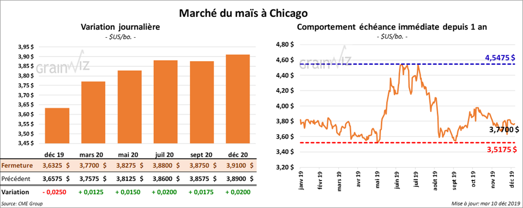 Présenté ce midi, le rapport mensuel d’offre et de demande indique que les inventaires de maïs US de fin d’année sont demeurés inchangés comparativement au mois de novembre à 1,91 milliard de boisseaux. Le USDA estime également que la production de maïs brésilien reste la même à 101 millions de tonnes. Pour l’Argentine, l’instance américaine évalue toujours la production de maïs à 50 millions de tonnes. De son côté, CONAB a augmenté son évaluation mensuelle de la production de maïs brésilien de 50,000 tonnes à 98,41 millions de tonnes. Mondialement, le USDA estime que la consommation de maïs a augmenté de 0,08 % par rapport à l’an passé à 300 millions de tonnes.