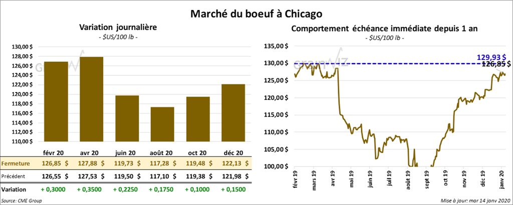 Les contrats de bœuf US ont terminé la session en hausse de 35 cents. Les contrats de veau US aux échéances les plus rapprochées ont fini la journée en baisse de 12 à 15 cents.
