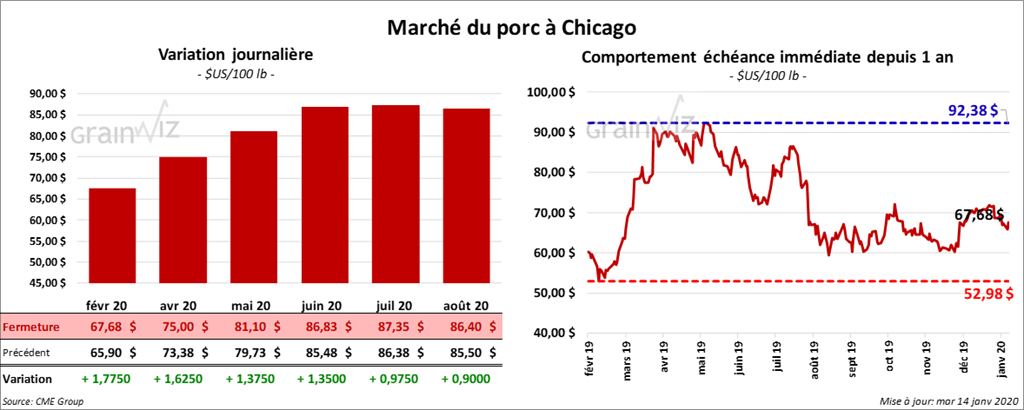 Le 10 janvier dernier, le CME Lean Hog Index était en baisse de 37 cents à 58,99 $. Cet après-midi, la valeur moyenne des découpes a été en hausse de 5 cents à 74,29 $. Sur la base nationale, le prix moyen au comptant de la carcasse était en progression de 97 cents à 51,56 $.