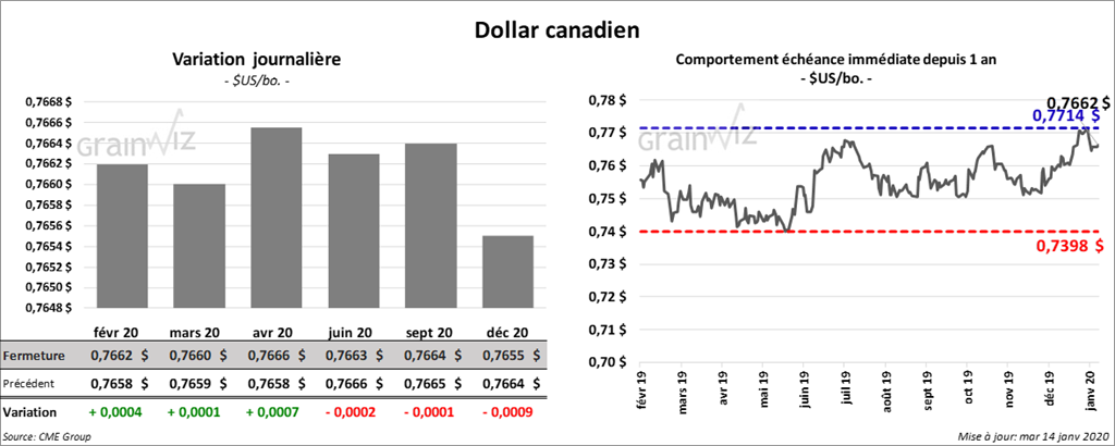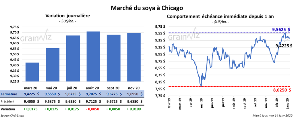 Les contrats de soya US ont terminé la session au neutre en prévision de la signature de l’accord phase 1. La plupart des contrats de soya US aux échéances les plus rapprochées ont terminé légèrement en baisse. Celui avril 20 a clôturé en baisse de ¼ cent. Le contrat de tourteau de soya US mars 20 a également terminé la session en baisse de 1,80 $. Par contre, les contrats d’huile de soya ont fini en hausse de 12 points. Le contrat janvier 19 a expiré à 9,28 ½ $ US.