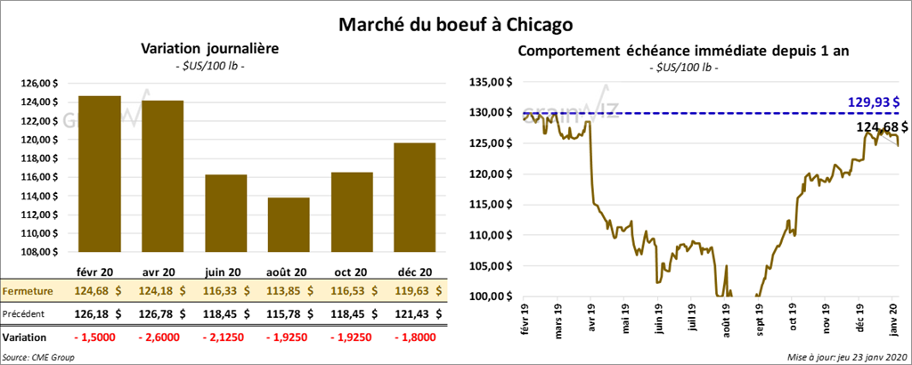 Les contrats de veau US aux échéances les plus rapprochées ont fini la journée avec des pertes de 2,50 à 2,77 $. Le contrat janvier 20 a reculé de 1,15 $ alors qu’il lui reste une semaine avant son expiration. Les contrats de bœuf US aux échéances les plus rapprochées ont également terminé dans le rouge de 1,50 à 2,60 $.