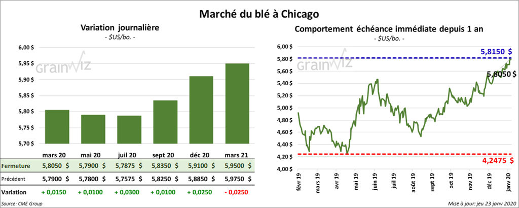 À la fermeture des marchés, les contrats de blé à Chicago avaient gagné de 1 ¾ à 2 ¾ cents. À Kansas, le blé a terminé en baisse de ¼ à 1 cent. À Minneapolis, les contrats de blé de printemps ont fini entre un recul de ½ cent et une progression de ¼ cent.