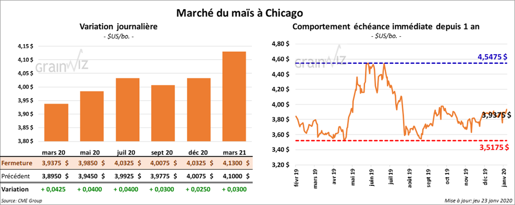Les contrats de maïs US ont fini la session à la hausse, poussés par celle de la demande de maïs US. Le contrat mars 20 a gagné 5 cents.