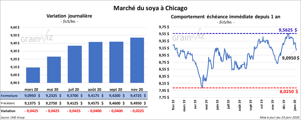 Les contrats de soya US aux échéances les plus rapprochées ont terminé la journée avec des baisses de 4 ¼ cents. Le contrat de tourteau de soya US mars 20 a gagné 1 $/tonne. Le contrat d’huile de soya US mars 20 a reculé de 54 cents.