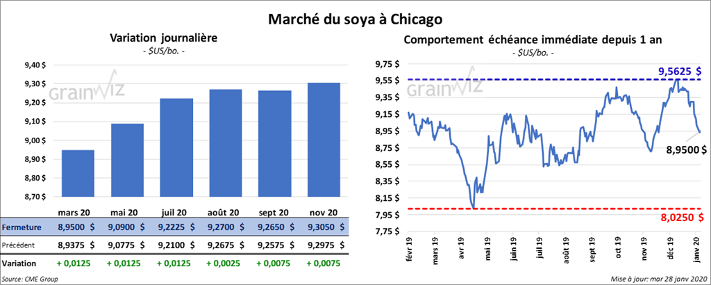 Les contrats de soya US aux échéances les plus rapprochées ont clôturé en baisse de 2 à 2 ¼ cents. Le tourteau a également reculé de 20 cents/tonne. À la fermeture du marché le contrat d’huile de soya US mars 20 était en baisse de 6 points.
