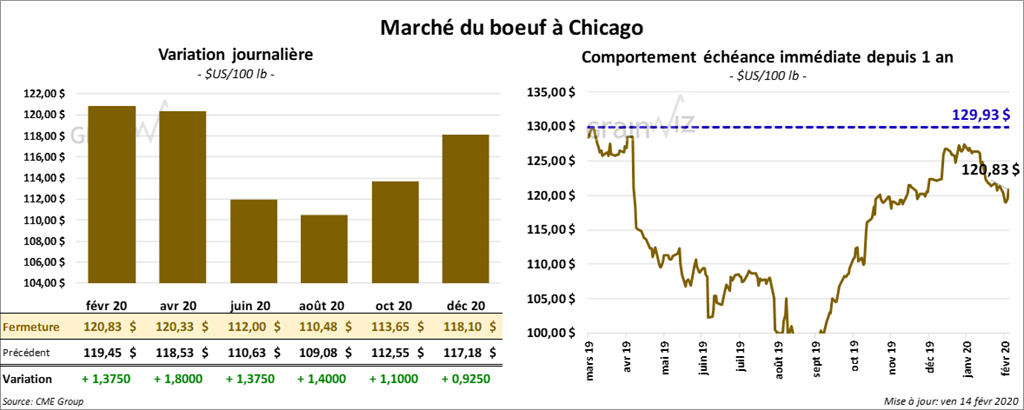 Les contrats de bœuf US ont clôturé en hausse. Le contrat avril 20 a le plus progressé avec des gains de 1,80 $. Les contrats de veau US ont également terminé la journée dans le vert de 2,20 à 2,42 $.
