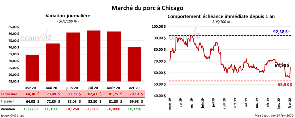 Le contrat de porc US février 20 a expiré aujourd’hui à 55,90 $ après une baisse de 10 cents. Les autres contrats aux échéances les plus rapprochées ont clôturé en hausse de 12 à 22 cents.