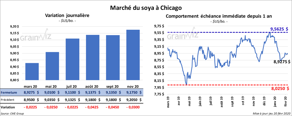 À la fermeture du marché, les contrats de soya US aux échéances les plus rapprochées étaient en baisse de 5 cents. Le tourteau de soya US a également terminé dans le rouge de 10 cents/tonne. Le contrat d’huile de soya US mars 20 a reculé de 22 points.