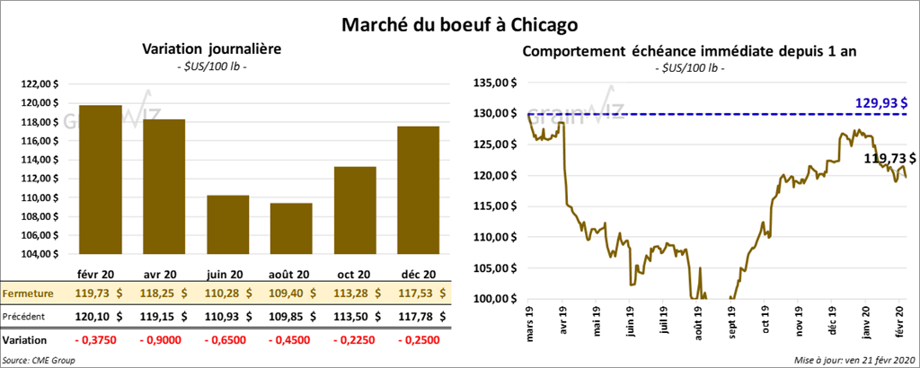 Les contrats de bœuf US aux échéances les plus rapprochées ont terminé la session avec des pertes de 37 à 90 cents. Sur la semaine, le contrat avril 20 a reculé de 1,10 $. Les contrats de veau US aux échéances les plus rapprochées ont clôturé en baisse de 42 à 72 cents. Pour le contrat mars 20, la baisse d’aujourd’hui n’a pas effacé le gain de la semaine de 1,67 $.