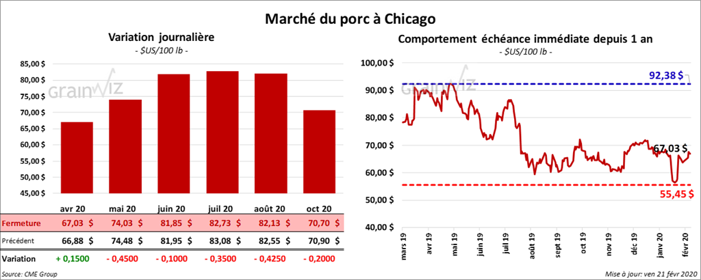 Les contrats de porc US ont terminé la journée sur une note partagée. Le contrat avril avait gagné 15 cents. Sur la semaine, il a pris 2,72 $. Les contrats différés ont clôturé en baisse.