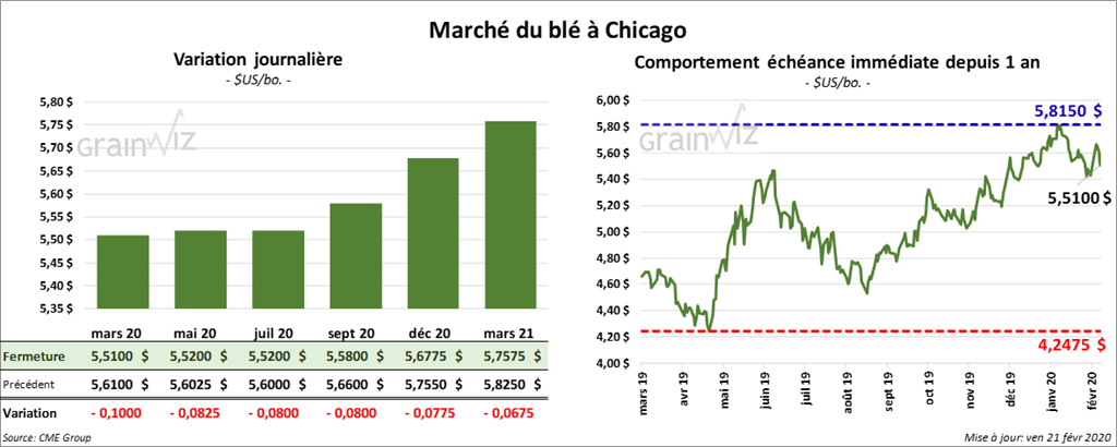 Les options de blé US mars 20 ont expiré aujourd’hui. À Chicago, les contrats de blé tendre rouge d’hiver ont clôturé en baisse de 9 cents sans éliminer leurs gains de la semaine. Toujours à Chicago, sur la semaine, les contrats de blé ont progressé de 8 ¼ cents. À Kansas, le blé a terminé la journée en baisse de 5 ¼ cents mais sur la semaine, il a gagné 2 ¾ cents. Le contrat de blé dur rouge de printemps mars 20 a reculé de 3 ½. Sur la semaine, il a perdu ½ cent.