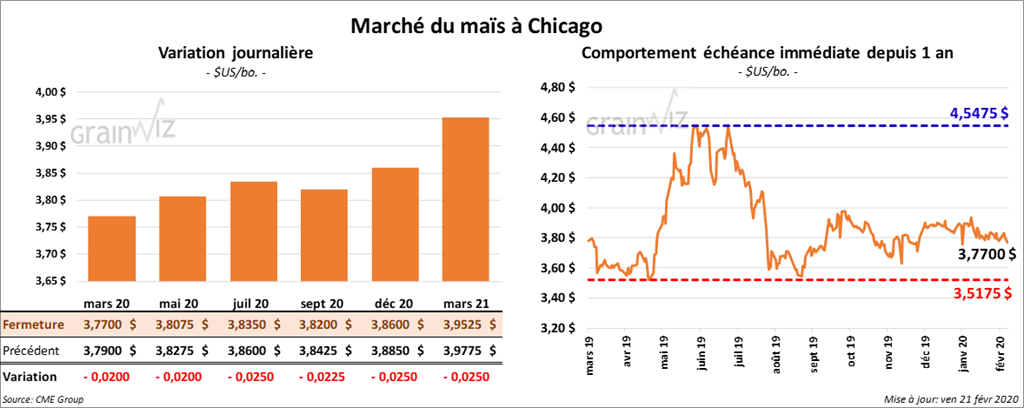 À la fermeture du marché, les contrats de maïs US étaient baisse de 1 ½ à 2 cents. Les options de mars 20 ont expiré aujourd’hui.