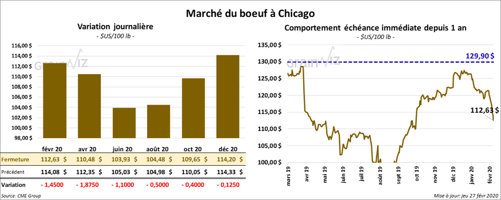 Les contrats de bœuf US aux échéances les plus rapprochées ont terminé la session avec des pertes de 1,57 à 2,32 $. Ceux de veau US ont aussi fini la journée en baisse par 3 chiffres. Les contrats aux échéances les plus rapprochées ont reculé de plus de 2,42 $.