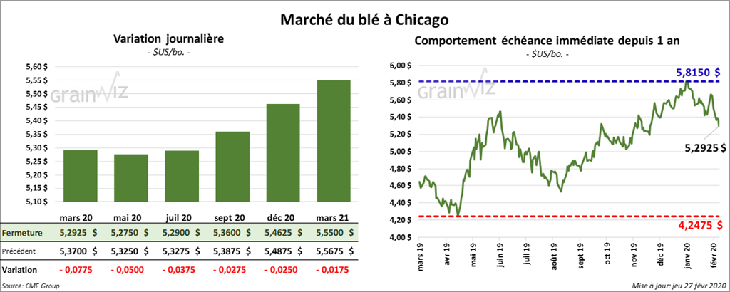 Cet avant-midi, le rapport sur les ventes à l’exportation a indiqué que celles de blé US ont été de 381,799 tonnes au cours de la semaine du 20 février dernier, ce qui était inférieur aux attentes des marchés. Les ventes ont représenté une augmentation hebdomadaire de 10,25 %, mais aussi une baisse annuelle de 30,43 %. Les ventes de la nouvelle récolte ont été de 68,100 tonnes. Par ailleurs, les exportations de blé US au cours de la semaine ont été de 408,029 tonnes, ce qui correspondait à une baisse hebdomadaire et à une réduction annuelle de 39,75 %. Les exportations de la semaine du 20 février dernier ont poussé le cumulatif annuel à 17,618 millions de tonnes, soit à une hausse de 12,56 % par rapport à l’an dernier.