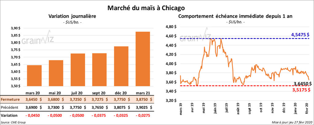 Les contrats de maïs US aux échéances les plus rapprochées ont terminé la journée en baisse de 5 à 6 ½ cents.