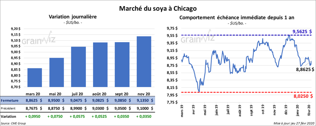 Ce matin, le rapport sur les ventes à l’exportation indiquait que celles de maïs US ont été de 864,635 tonnes durant la semaine du 20 février dernier, ce qui était une baisse de 30,8 % par rapport à la semaine précédente et de 30,3 % comparativement à la même période l’an dernier. Les ventes de la nouvelle récolte ont été de 113,620 tonnes. Les exportations hebdomadaires ont été de 844,671 tonnes, ce qui représentait une augmentation de 9,8 % comparativement aux expéditions de l’an passé. Sur la semaine les ventes de sorgo ont été les plus élevées depuis décembre 2014, avec 444,519 tonnes. Pour le sorgo, le total des engagements est de 1,667 million de tonnes, ce qui correspond à une hausse de 124,45 % par rapport à l’an dernier.