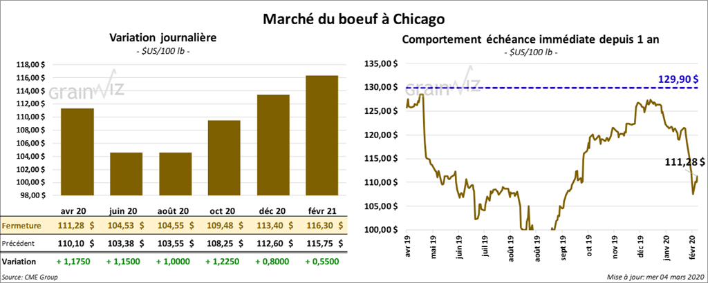 Les contrats de bœuf US ont terminé la session en hausse de 1,12 à 1,42 $. Ceux de veau US ont également clôturé en progression par 3 chiffres. Pour les contrats aux échéances les plus rapprochées, la hausse a été de 2,15 $.