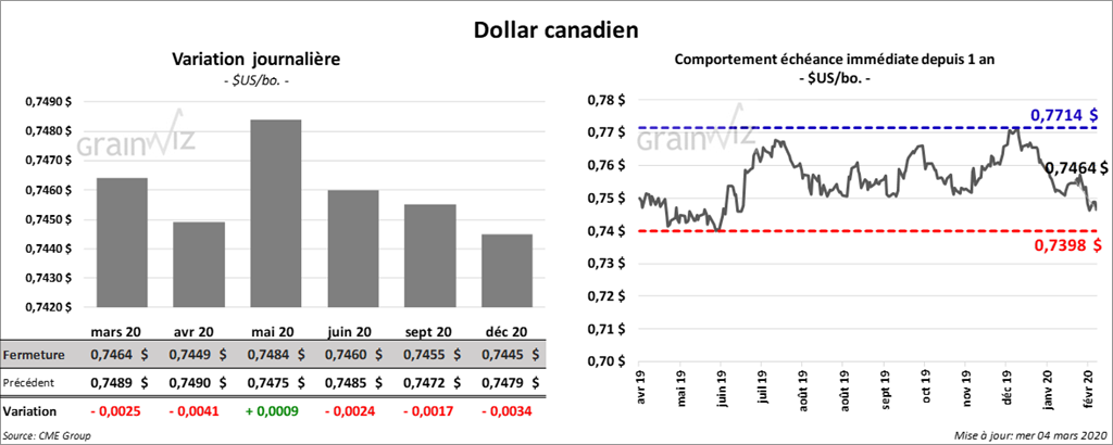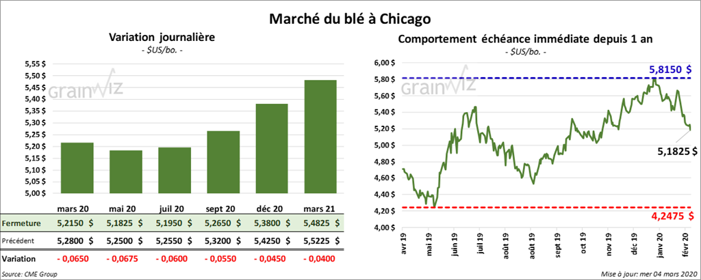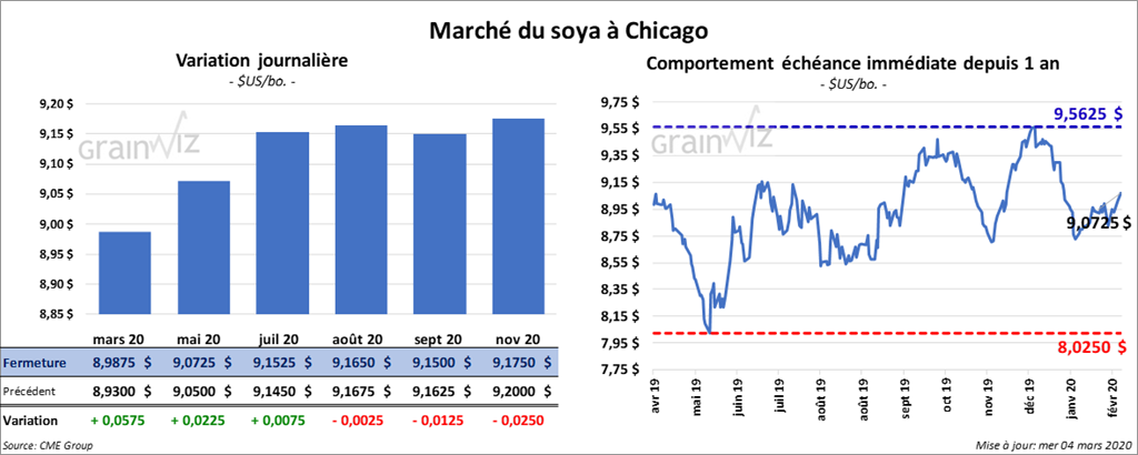 Concernant le rapport sur les ventes à l’exportation de la semaine du 27 février dernier, qui sera présenté demain, les analystes prévoient des ventes de blé US 2019/2020 entre 350,000 et 600,000 tonnes. Pour la nouvelle récolte, un résultat entre 25,000 et 75,000 est attendu.