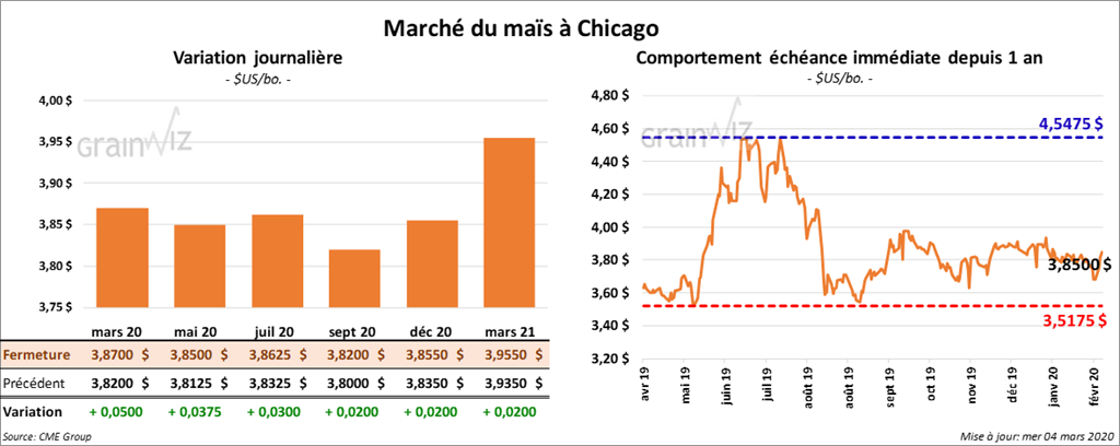 Demain, le USDA va présenter son rapport hebdomadaire sur les ventes à l’exportation. Dans le cas du maïs US 2019/2020, le marché s’attend à un résultat entre 0,7 et 1,2 million de tonnes pour la semaine du 27 février dernier. Pour la nouvelle récolte, un résultat entre 0 et 100,000 tonnes est anticipé.