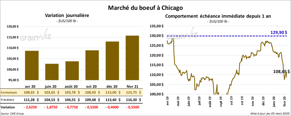 Les contrats de bœuf US ont terminé la journée dans le rouge de 77 cents à 2,65 $. Le contrat avril 20 a été le plus faible. Les contrats de veau US aux échéances les plus rapprochées ont également fini la session en baisse par 3 chiffres, entre 1,22 et 1,90 $.