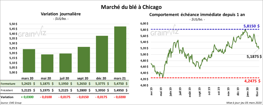 Les contrats de blé US ont fini la journée sur une note partagée. À Chicago, le contrat mai 20 de blé tendre rouge a clôturé en hausse de ½ cent. À Kansas, le contrat de blé dur rouge d’hiver mai 20 a terminé la séance en baisse de 7 cents. Les contrats de blé de printemps US ont fini la session dans le rouge de 7 ¼ cents.