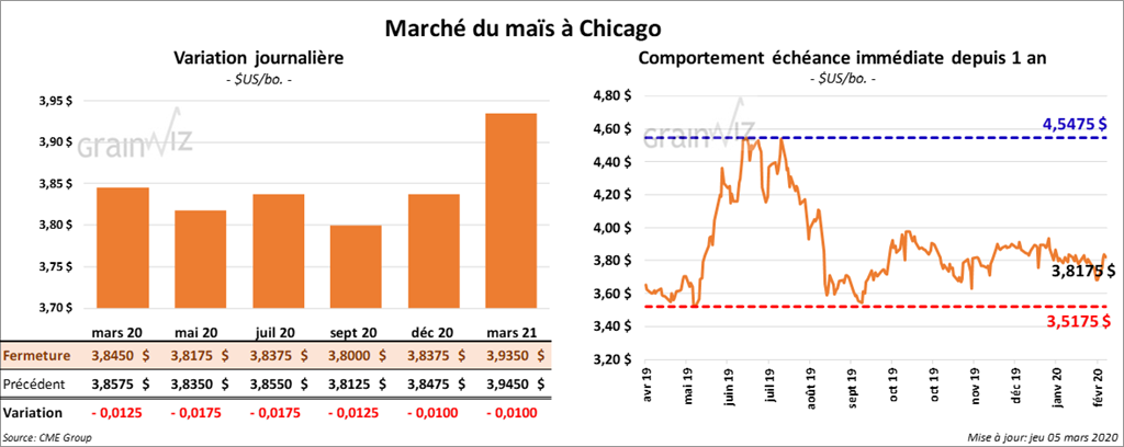 Les contrats de maïs aux échéances les plus rapprochées ont terminé la session en baisse de 2 à 3 ¼ cents.