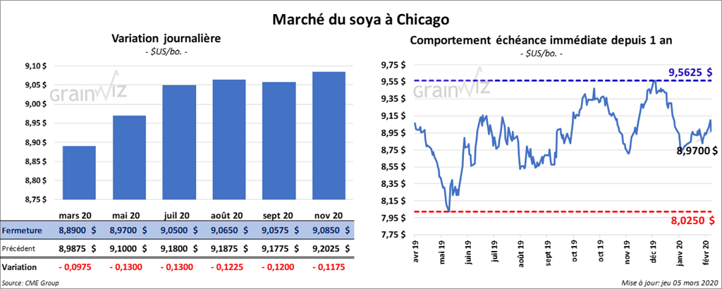 Les contrats de soya US ont clôturé en baisse de 9 ¾ à 10 ¼ cents. Le contrat de tourteau de soya US mai 20 a perdu 5,00 $/tonne. Le contrat d’huile de soya US mai 20 a terminé dans le rouge de 35 points.