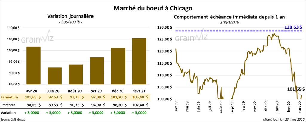 Le rapport Cattle on Feed du mois de mars, parut vendredi dernier, indiquait qu’au 1er mars 20, les inventaires des parcs d’engraissement étaient de 11,806 millions de têtes. Les placements au cours du mois de février dernier ont été de 1,711 millions de têtes et toujours pour le mois de février 20, la commercialisation a concerné 1,775 million de têtes.