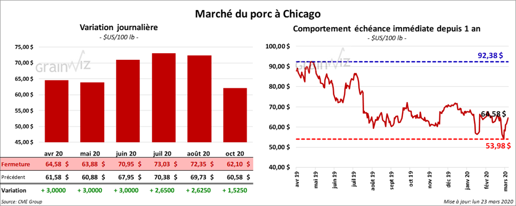 Le 19 mars dernier, le CME Lean Hog Index a été en hausse de 85 cents à 62,18 $.