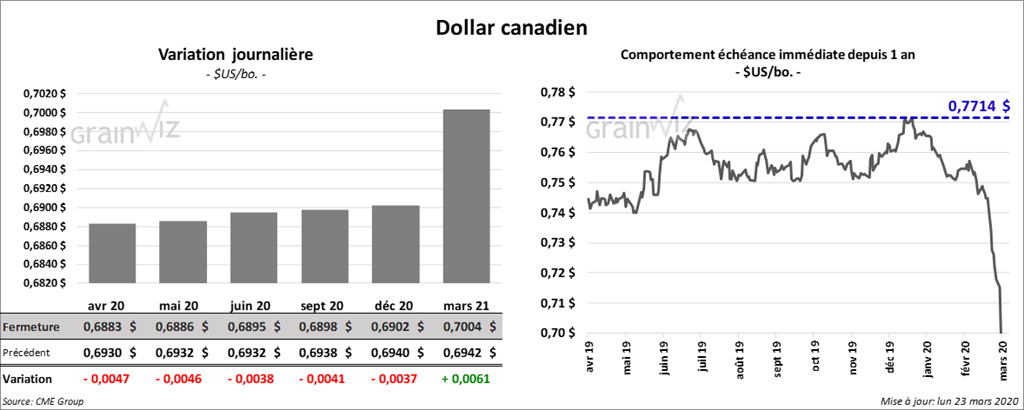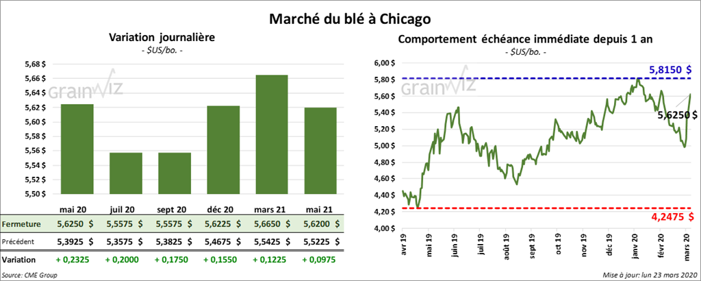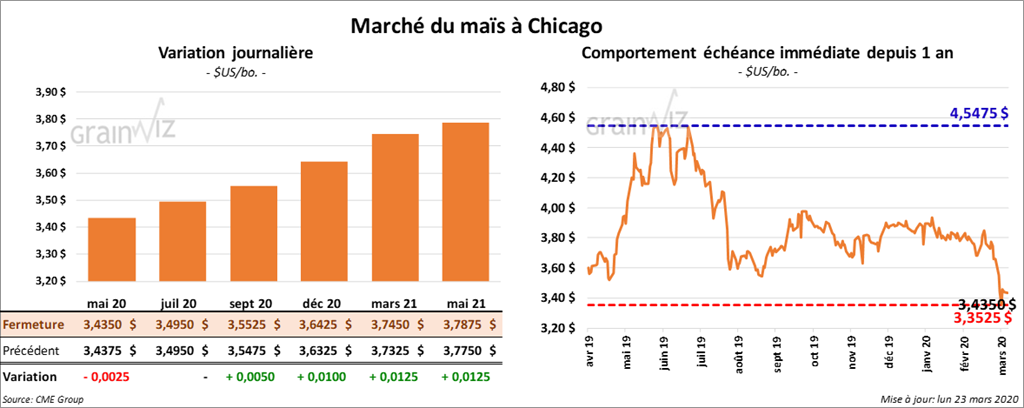 Les contrats de maïs US ont terminé la journée sur une note partagée. Le contrat juillet 20 a fini inchangé alors que ceux septembre et décembre 20 ont clôturé en hausse à respectivement ½ cent et 1 cent. Par contre, le contrat mai 20 a reculé de ¼ cents.