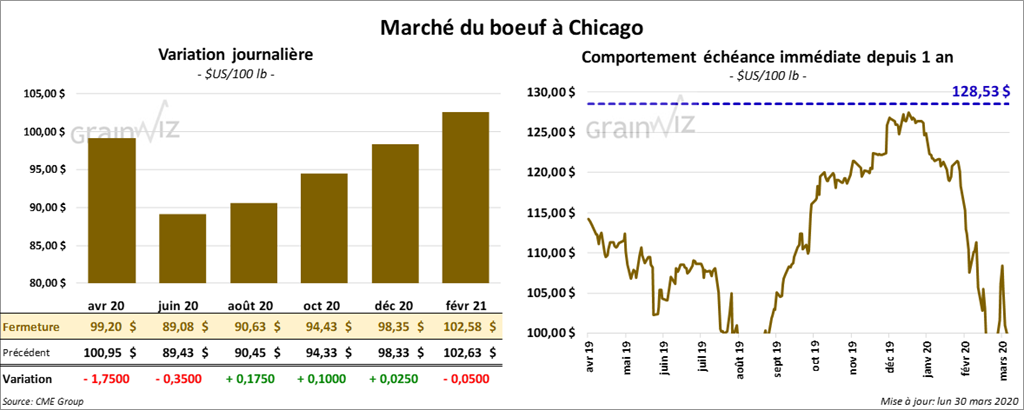 Le contrat de bœuf US avril 20 a clôturé en baisse de 1,75 $, alors que les autres contrats aux échéances les plus rapprochées ont terminé la journée quelque part entre une baisse de 35 cents et une hausse de 17 cents. Quant au veau US, il a fini la session en recul de 2 à 55 cents. Le contrat avril 20 a été le plus faible.