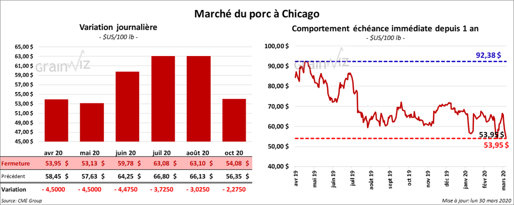 Le 26 mars dernier, le CME Lean Hog Index a été en hausse de 29 cents à 66,46 $.