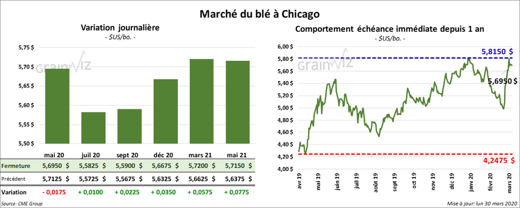 Les contrats de blé US ont fini la journée dans le rouge. À Chicago, le blé a terminé sur une note partagée. Alors que le contrat mai 20 a perdu 1 ¾ cents, les contrats juillet 20 et septembre ont été en hausse de 1 à 2 ¼ cents. Le contrat de blé dur rouge d’hiver mai 20 a terminé inchangé, mais les autres contrats aux échéances les plus rapprochées ont progressé de 1 ¼ cents. À Minneapolis, les contrats de blé ont clôturé en baisse. Celui mai 20 a reculé d’un cent alors que les autres contrats aux échéances les plus rapprochées ont fini la session avec des pertes de ½ à 2 ¼ cents.