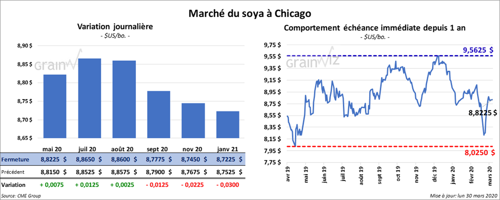 Les contrats de soya US ont fini la session sur une note partagée. Le contrat juillet 20 a clôturé en hausse d’une fraction à 1 ¼ cents. Par contre, les contrats septembre 20 et novembre 20 ont fini en baisse respectivement de 1 ¼ et 2 ¼ cents. Le tourteau de soya US a terminé la journée avec un gain de 2,40 $/tonne. L’huile de soya US a gagné 2 points.