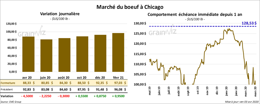 Les contrats de bœuf US ont fini la séance en baisse de 30 cents à 4,50 $. Les contrats de veau US ont également clôturé dans le rouge entre 2,42 $ et 3,55 $. Sur la semaine, le contrat avril 20 a perdu 12,82 $.