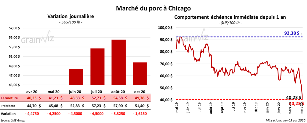 Les contrats de porc US aux échéances les plus rapprochées ont fini la session en baisse de 4,25 $ à 4,50 $. Sur la semaine, le contrat avril 20 a perdu 18,23 $.