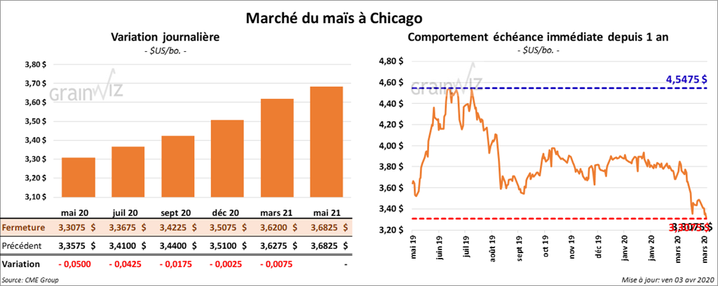 Ce vendredi, les contrats de maïs US septembre 20 et décembre 20 ont fini la journée en hausse de ¼ à 1 cent. Par contre, les contrats mai 20 et juillet 20 ont clôturé en baisse. Sur la semaine, le contrat mai 20 a reculé de 15 ¼ cents.