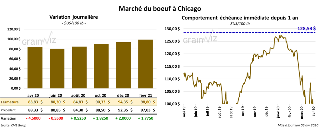 Les contrats de bœuf US ont terminé la journée sur une note partagée. Le contrat avril 20 a clôturé à sa limite à la baisse. Les autres contrats ont terminé quelque part entre une baisse de 55 cents et une hausse de 52 cents. Les contrats de veau US ont fini la séance avec des gains de plus de 2,17 $.