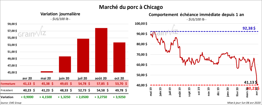 Les contrats de porc US aux échéances les plus rapprochées ont fini la journée avec des gains de 90 cents à 4,15 $.