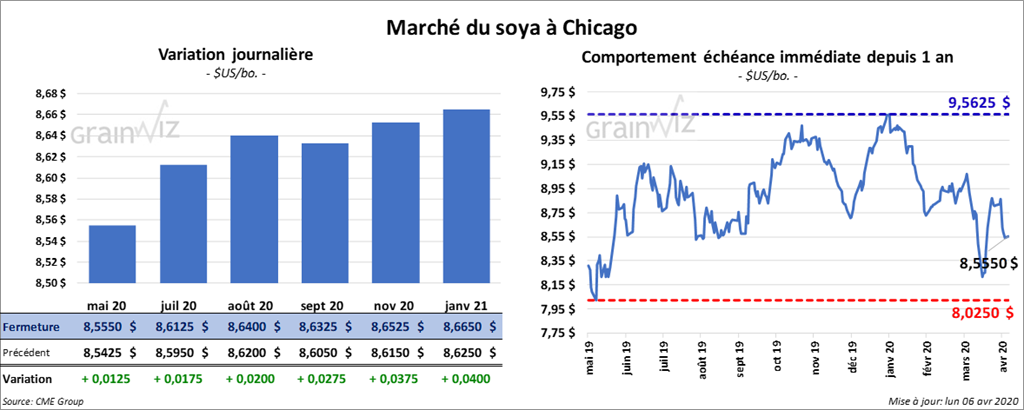 Les contrats de soya US ont fini la journée en hausse de 1 ¼ à 2 ¾ cents en raison de la force de l’huile de soya US. Le contrat de tourteau de soya US mai 20 a clôturé en baisse de 6,20 $/tonne. Le contrat d’huile de soya US mai 20 a terminé la session avec des gains de 40 points.